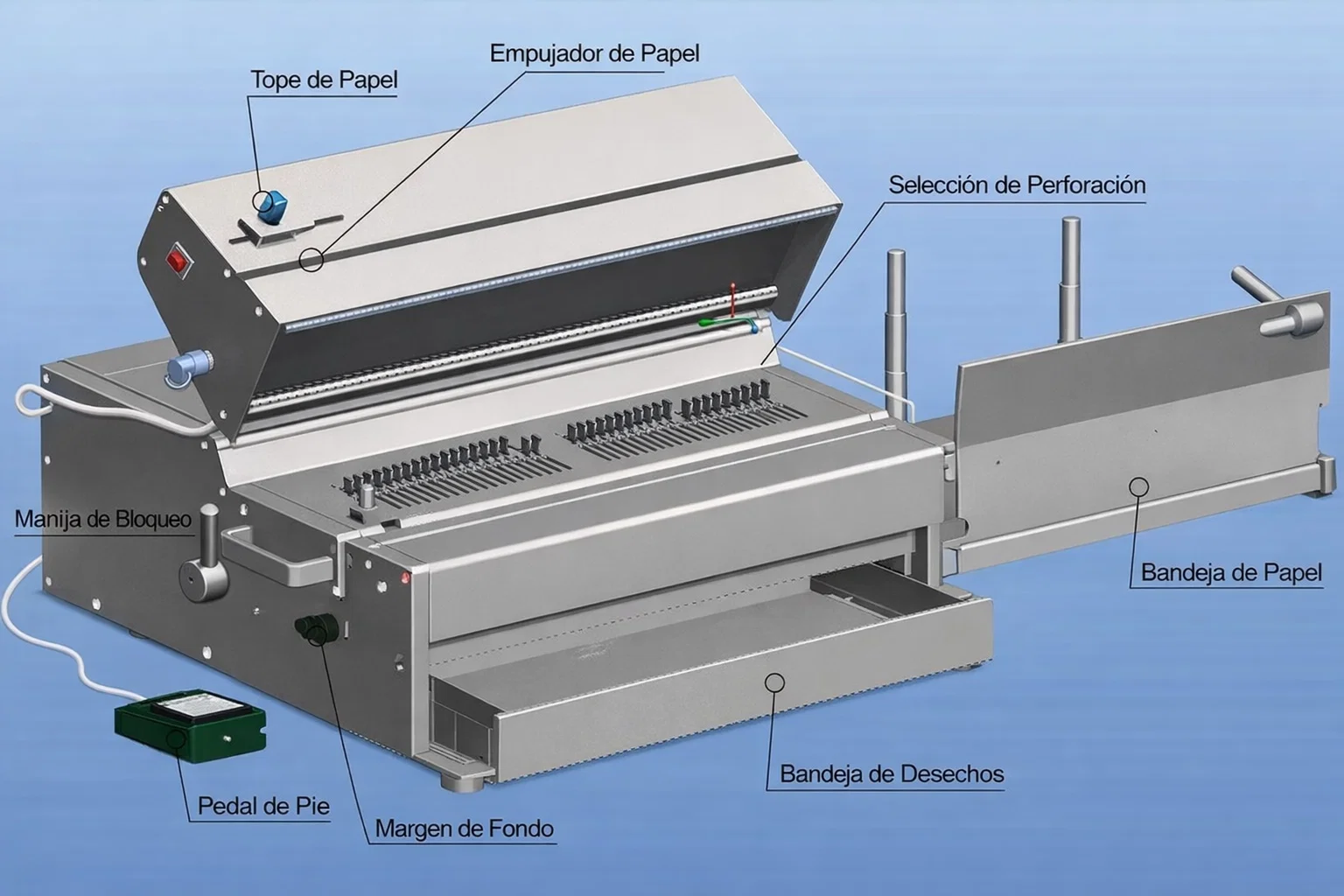 Además, su sistema de accionamiento mediante pedal mejora la ergonomía del operador, permitiendo mantener las manos libres durante el proceso de perforación y encuadernado, aumentando así la productividad y la comodidad en el trabajo diario.