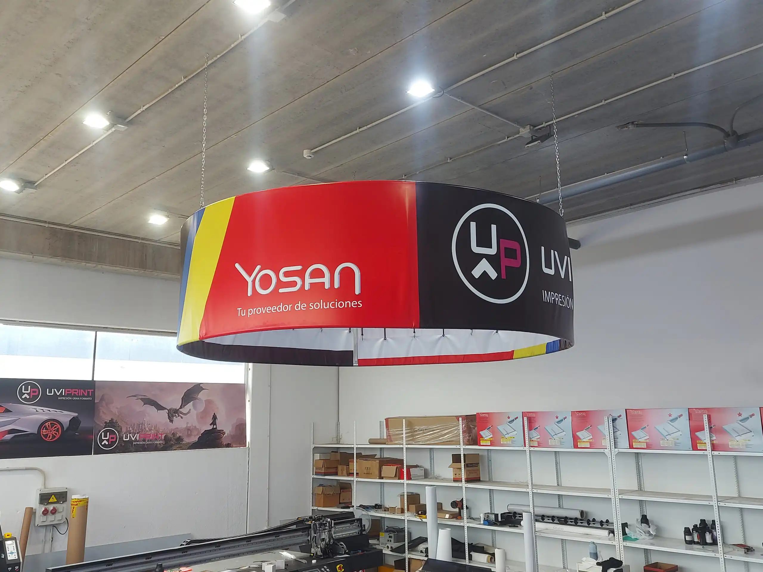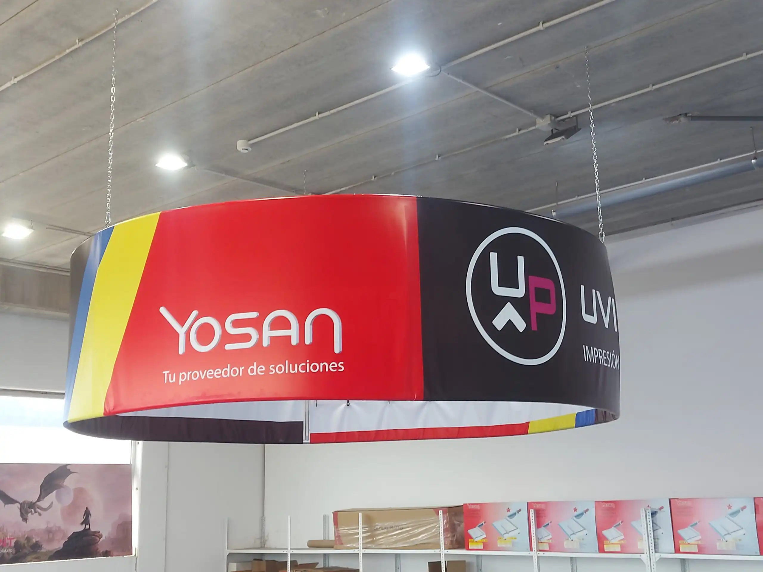 Las pancartas colgantes son una excelente manera de usar el espacio sobre el stand de su feria comercial. Los letreros del techo cuelgan alto y se ven desde distancias mucho mayores. Esta pantalla colgante  ya sea circular o rectangular garantizan su visionado por su colocación aérea y su gran tamaño.