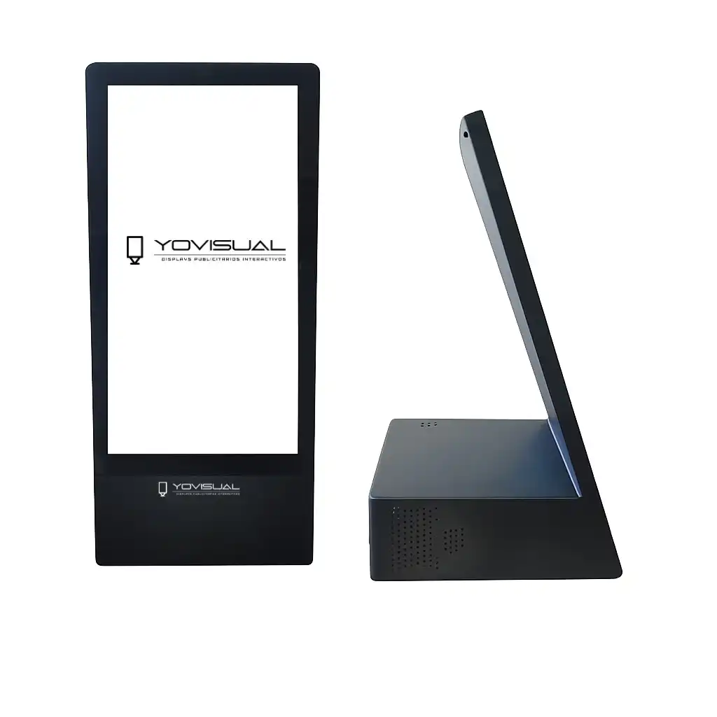 Este formato funciona especialmente bien porque está “en el sitio correcto”: delante del cliente, en el momento de decidir. Por eso se utiliza como pantalla interactiva de sobremesa para recepciones y como tótem sobremesa para punto de venta en comercios con flujo constante.