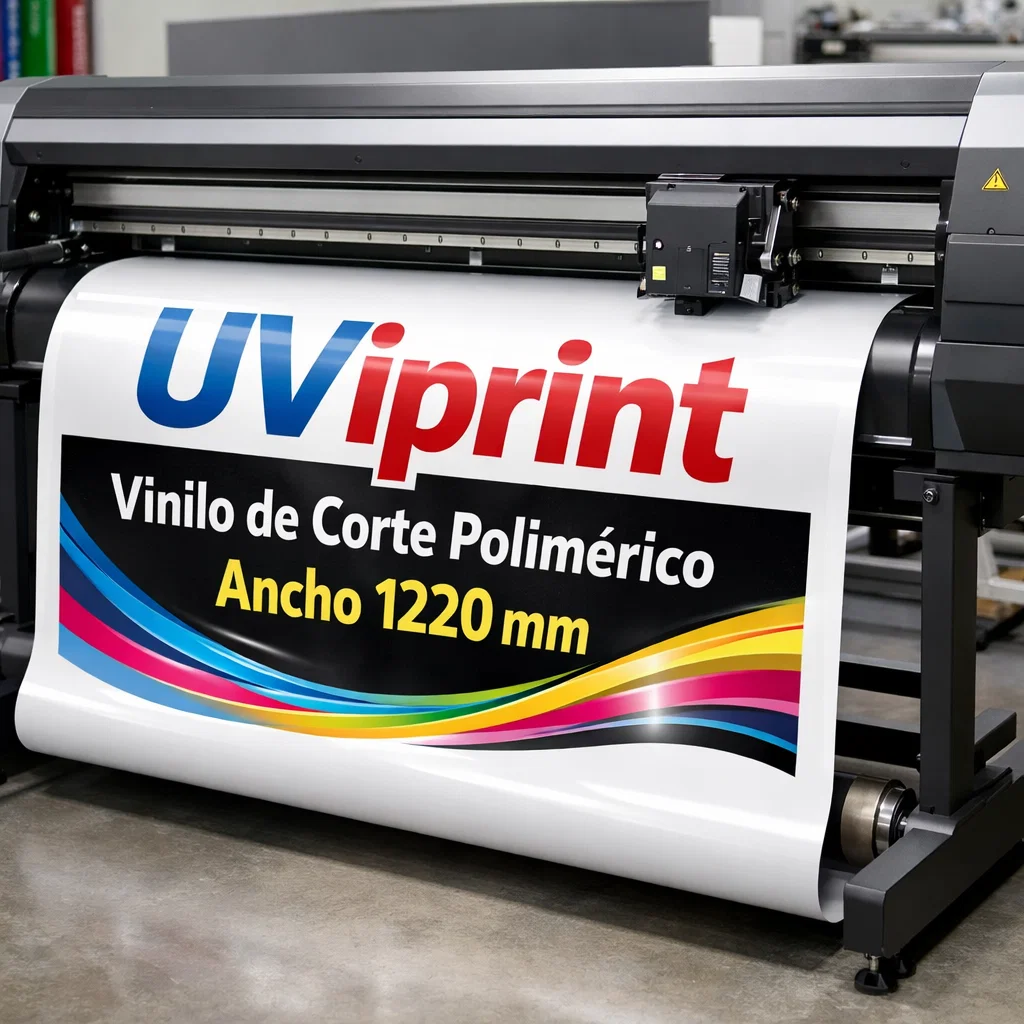 Vinilo de corte polimérico Uviprint en bobinas de 8 metros para rotulación y decoración profesional. Disponible en varios colores, mate o brillo, y anchos 610 mm y 1220 mm. Ideal para textos y diseños sin fondo.